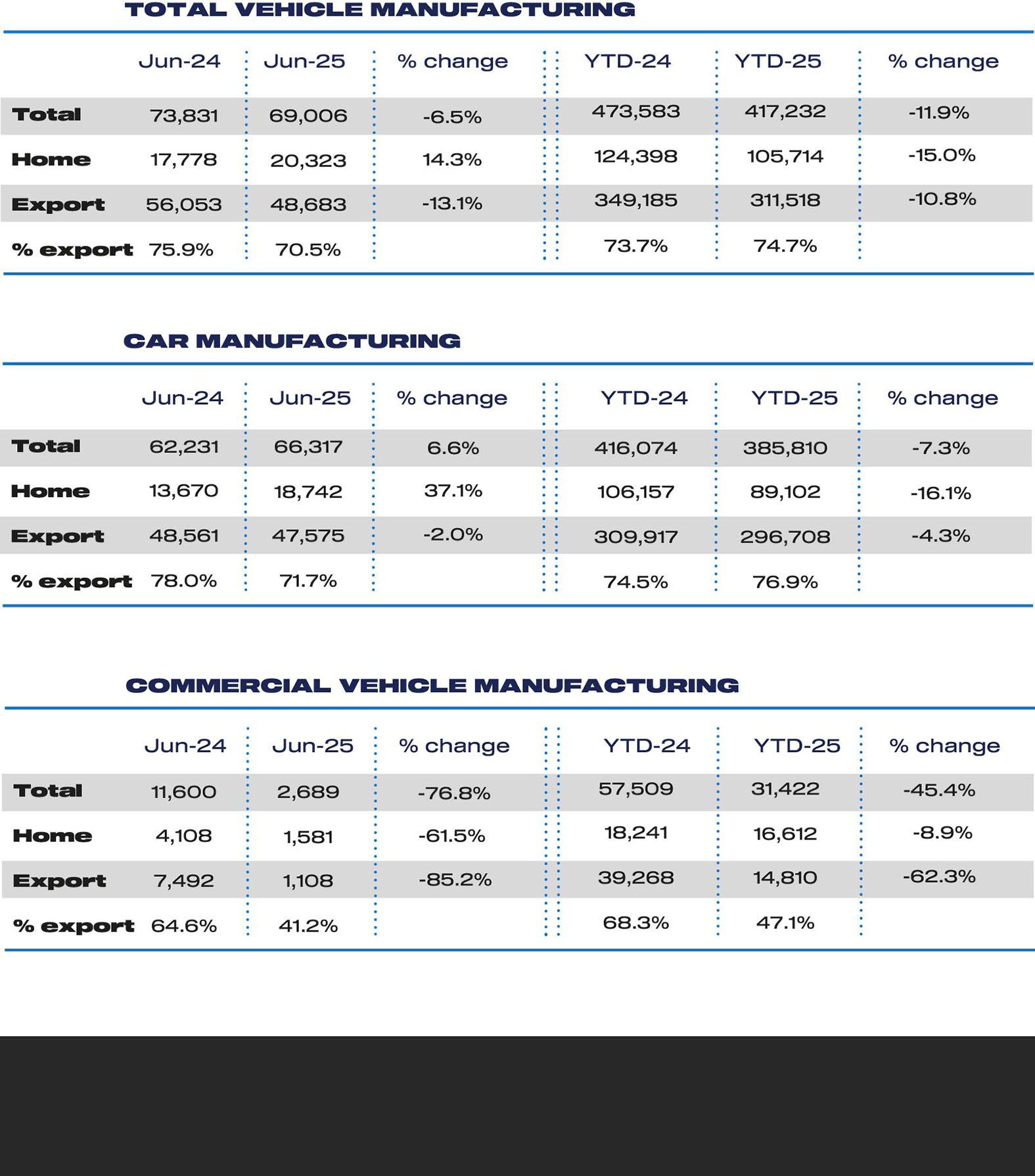 The decline was softened by a 6.6 per cent increase in car production in June, although this was in comparison with last year when model changeovers and supply chain issues stymied output.