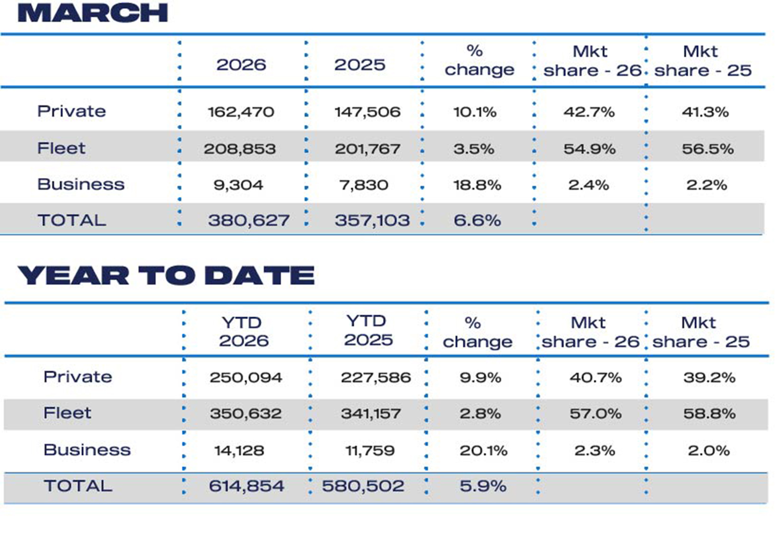 Growth was driven primarily by private demand, with retail registrations rising 10.1 per cent to 162,470 units. Fleet registrations increased 3.5 per cent to 208,853 units, while the smaller business sector grew 18.8 per cent to 9,304 units.
